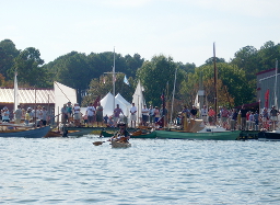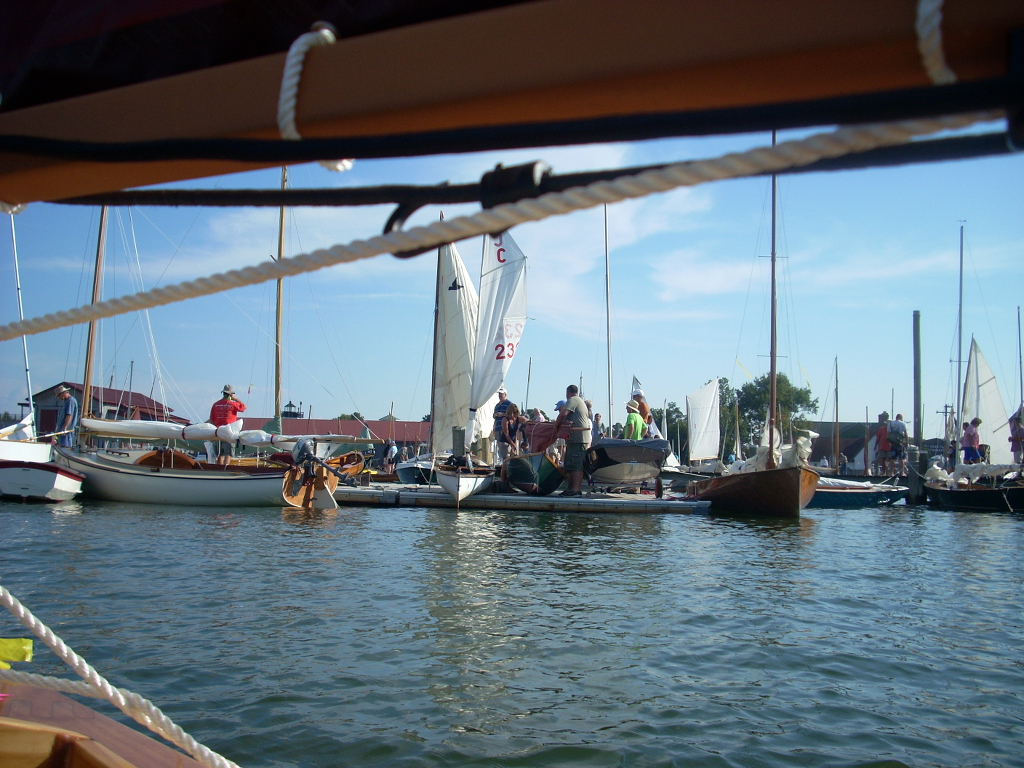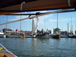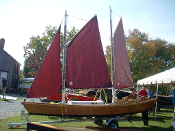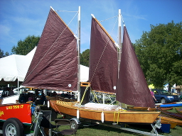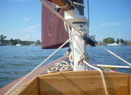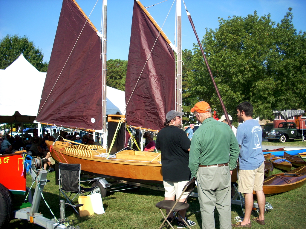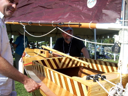 The first step next morning was to set up for the judging. There were a gratifying number of people stopping by to ask about the boat. The puzzle joints were the most popular topic, followed by the cockpit coaming. A lot of folks also wanted to know if it was from a kit. There were a few changes in the rigging from Okoumefest. Most obviously, all the cable ties were gone, replaced by robands and lacing. The robands allow the sail to be bent to the mast in approximately 1 minute per sail. |