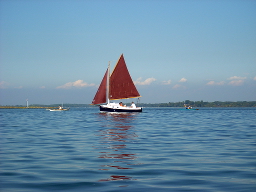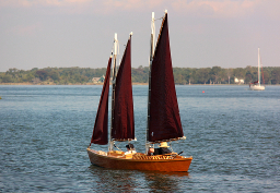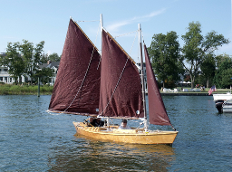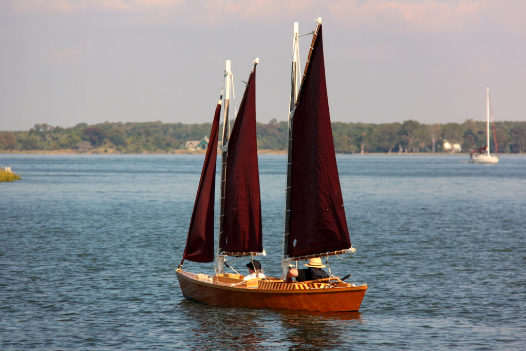 Out on the Miles River we run into John Harris, Mr. Chesapeake Light Craft himself, demonstrating the light air capablilities of the PocketShip. Tanbark sails, gaff rig, not too bad. All it needs is another, taller mast in the back. |