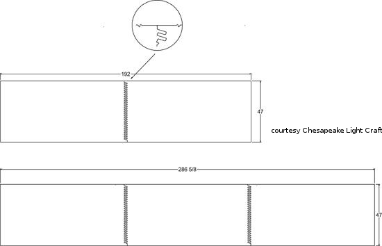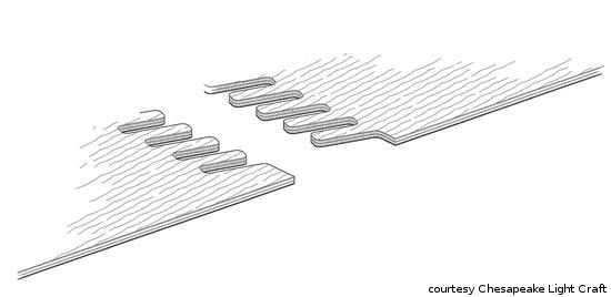 20 foot long pieces of marine plywood aren't cheap and I didn't feel like scarfing, so I decided to try a product sold by Chesapeake Light Craft . It's pieces of plywood with puzzle joints cut into the ends. The joints are precisely cut with a CNC machine and have the same bonding area (8x thickness) that a scarf joint has.