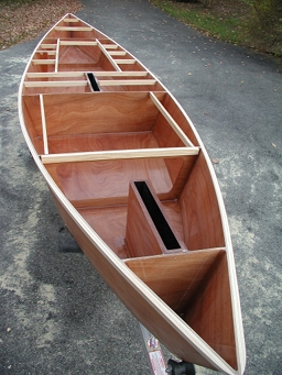 The drop keel and removable rudder wells after they have been trimmed and sanded to fit the bottom. The graphite/epoxy coating on the interior glass lining is clearly visible.