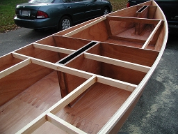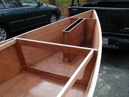 It also means that when the boat is heeled, there are no shear forces trying to slide the box across the bottom of the boat. Instead, there are compressive forces pushing the box harder against the bottom. Not only is this a stronger situation, it also means that the braces Bolger had at the intersection of the bottom and keel box are unnecessary.